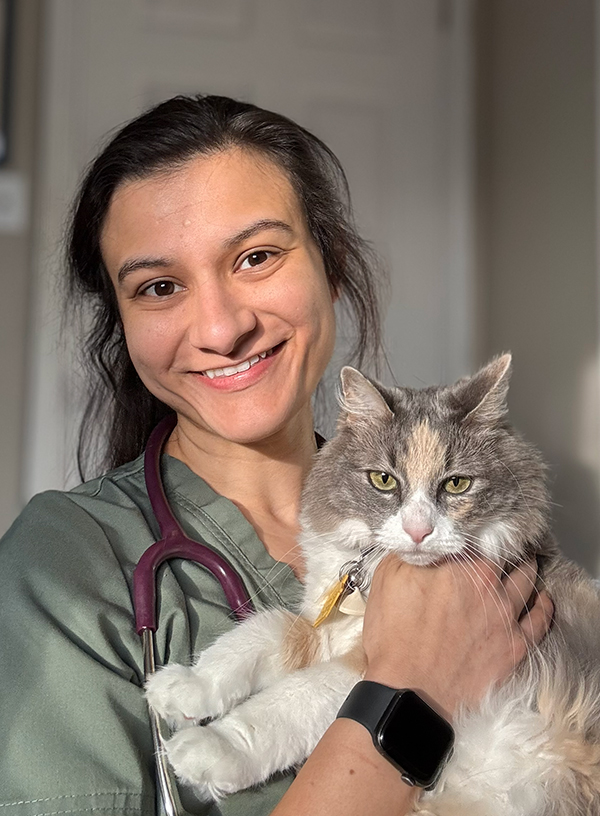 Her professional interests include internal medicine and preventive care for cats and dogs of all ages and temperaments; however, she has a soft spot for senior patients, palliative/end of life care, and feline medicine. She strives for low-stress, compassionate treatment and believes in partnering closely with owners, who know their pets best.